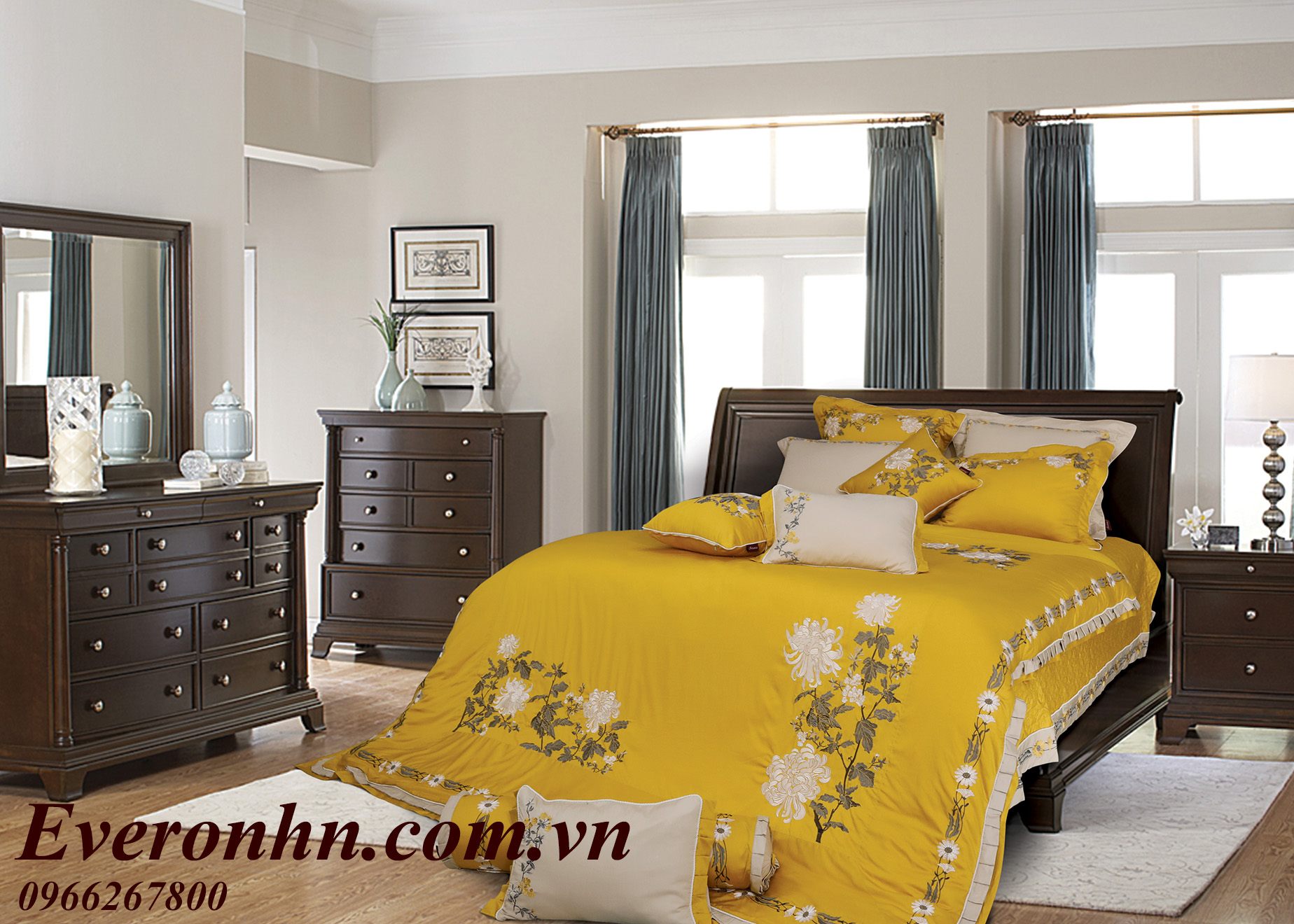 Lấy ý tưởng chính từ hoa cúc đại đóa,vẻ đẹp cổ điển của bông hoa làm toát lên sự quyến rũ của bộ chăn ga.Màu vàng của nền vải là màu trend của năm nay,màu vàng hoàng gia và đầy lôi cuốn rất phù hợp với nội thất cổ điển.
